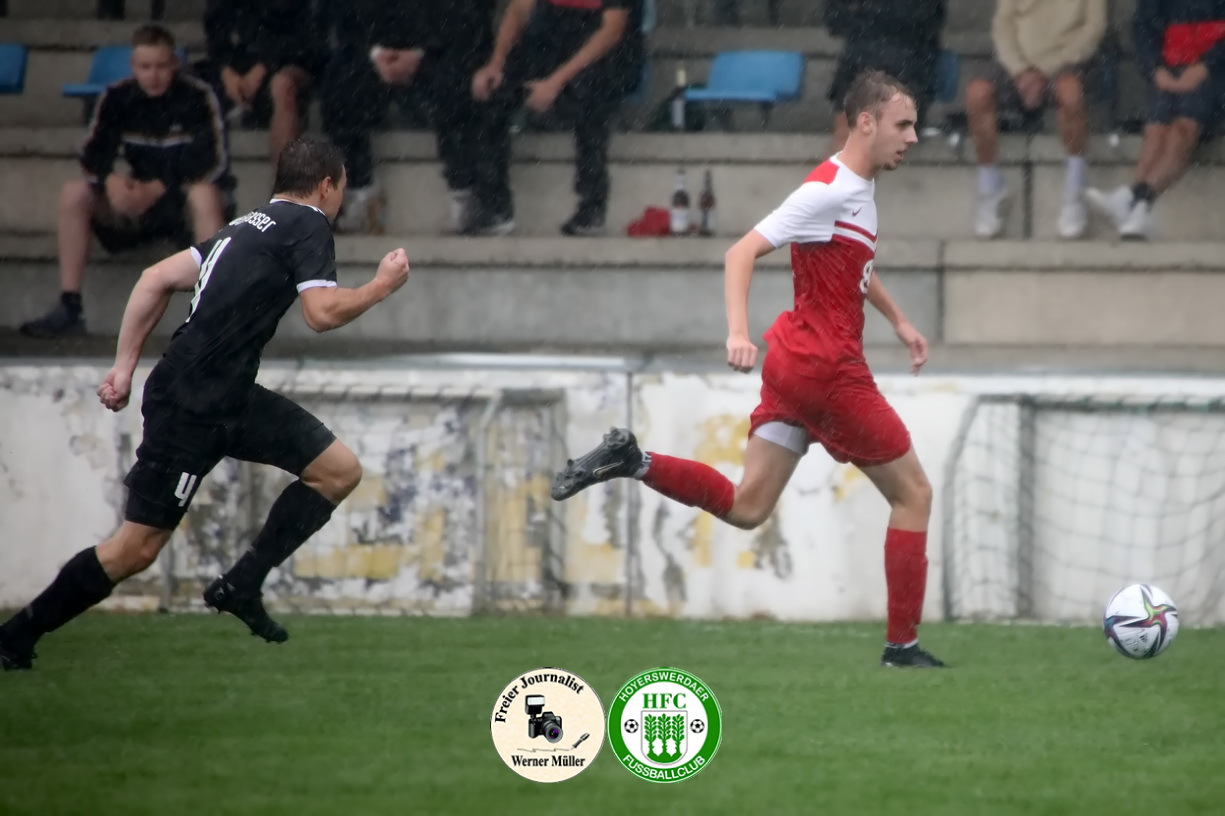 Die Unzufriedenheit über das Ergebnis war unverkennbar in den Gesichtern der HFC-Spieler nach Schlusspfiff abzulesen. „Wir hatten uns mehr vorgenommen, es war in jedem Fall mehr möglich, am Ende müssen wir mit dem Punkt leben“ , so Co-Trainer Oliver Göschick. Die Gastgeber zeigten vor 86 zahlenden Zuschauern im strömenden Regen die bessere Spielanlage und waren über 90 Minuten das aktivere und spielbestimmende Team. Das Führungstor war fußballerische Feinkost. Über zehn Stationen kombinierte sich der Aufsteiger aus der Abwehr im Kurzpassspiel über die linke Seite bis in den Gästestrafraum durch und Bruno Laser behielt völlig freistehend vor dem Gästetor die Übersicht und köpfte zum Führungstor ein.  „Leider haben wir durch meinen individuellen Fehler  im Spielaufbau Weißwasser sofort zurück ins Spiel gebracht“, ärgerte sich Kapitän Christopher Heinze am meisten über sich und den Moment, der zum Gegentor führte. Die Gäste, ausschließlich, abwartend und meist tief stehend,  spekulierten genau auf solche Situationen. So vereitelte Torhüter Dominik Krüger vor und nach der Pause (27.,52.) mit zwei tollen Paraden mögliche Gegentore. „Der Gegner muss nichts investieren, um zu Toren und Torchancen zu kommen“, kritisierte Trainer Stefan Hoßmang, um festzustellen, „dass wir in jeder Situation absolut konzentriert sein müssen.“  Sein Kollege Philipp Goltzsch attestierte nach Ende „dass Hoyerswerda heute klar das bessere Team war“. Der Heimsieg blieb allerdings aus, „da wir unsere sehr guten Chancen und Möglichkeiten nicht nutzen konnten (u.a. 12. Liebe, 33. Liebe, 41. Sow, 47. Sow, 48. Breuning, 68. Meinel )“, stellte Benjamin Hoßmang klar. Zum Glück vergab VfB-Kapitän Axel Buder (70.) nach missglückter Abwehr von Silvio Liebe die Siegchance für die Gäste.
