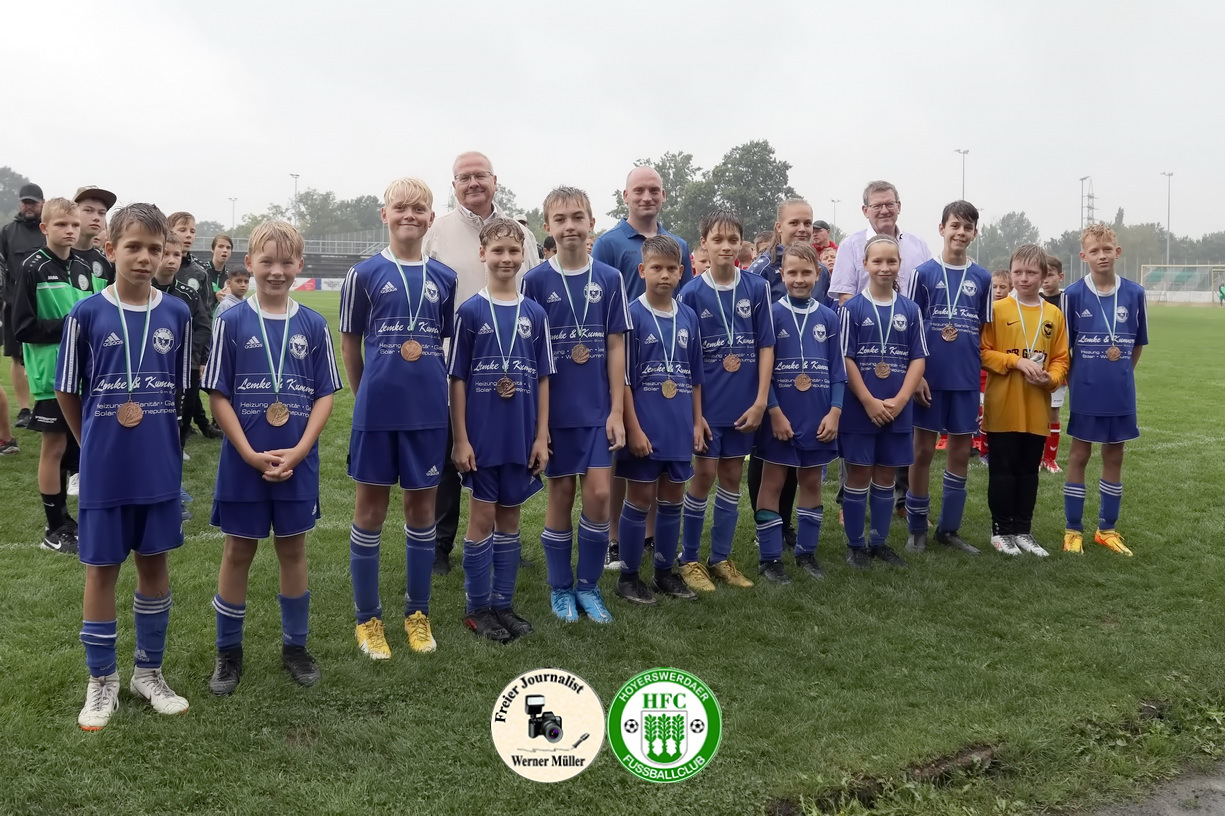 Aufgrund von kurzfristigen Erkrankungen und den widrigen Wetterbedingungen wurde dieses mal eine etwas kleinere aber nicht minderwertige Runde ausgespielt. So traten unsere Sportsfreunde der SG Weixdorf, DJK Blau-Weiß Wittichenau und SG Blau-Weiß Klein Gaglow sowie der heimischen HFC D-Jugend um Spielmodus jeder gegen jeden an. Es wurde gepasst, geschossen, gekämpft und gezaubert und die Trainer sowie Zuschauer konnten ein fußballerisches hochwertiges Turnier beobachten. Am Ende setzten sich die Kids aus Weißdorn verdient und durchgenässt als Turniersieger durch und holten sich den Pokal, aber jeder Spieler verdiente sich eine Medaille und bekam somit eine durch unseren Oberbürgermeister verliehen.