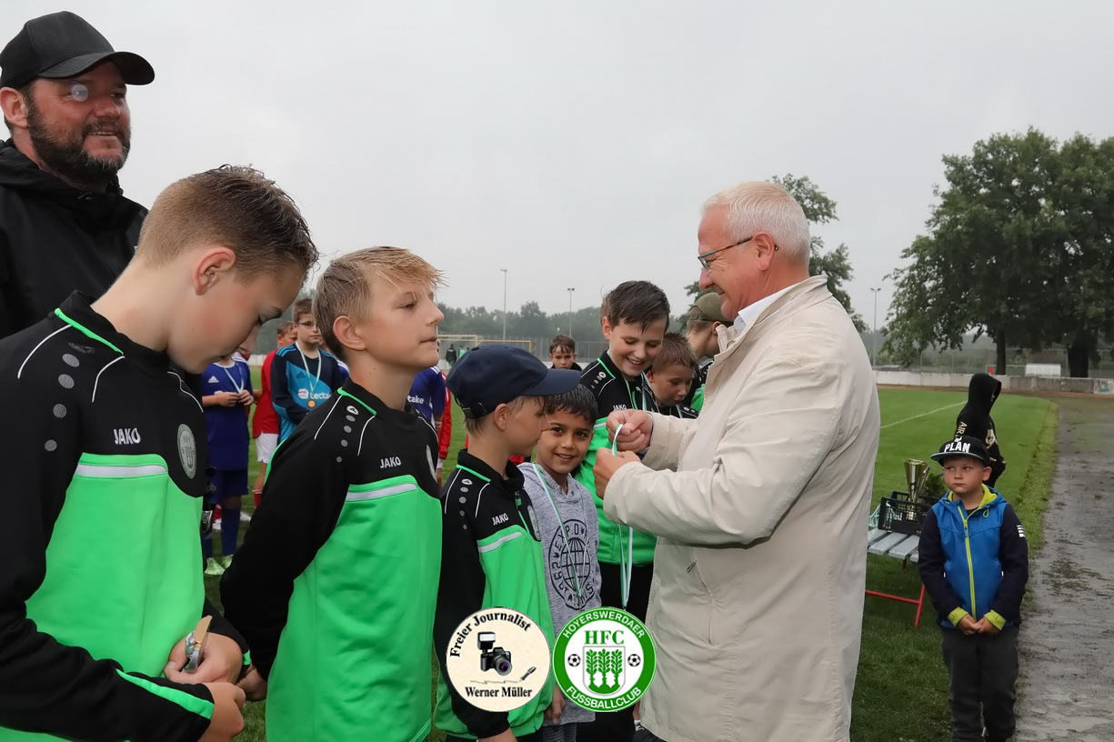 Aufgrund von kurzfristigen Erkrankungen und den widrigen Wetterbedingungen wurde dieses mal eine etwas kleinere aber nicht minderwertige Runde ausgespielt. So traten unsere Sportsfreunde der SG Weixdorf, DJK Blau-Weiß Wittichenau und SG Blau-Weiß Klein Gaglow sowie der heimischen HFC D-Jugend um Spielmodus jeder gegen jeden an. Es wurde gepasst, geschossen, gekämpft und gezaubert und die Trainer sowie Zuschauer konnten ein fußballerisches hochwertiges Turnier beobachten. Am Ende setzten sich die Kids aus Weißdorn verdient und durchgenässt als Turniersieger durch und holten sich den Pokal, aber jeder Spieler verdiente sich eine Medaille und bekam somit eine durch unseren Oberbürgermeister verliehen.