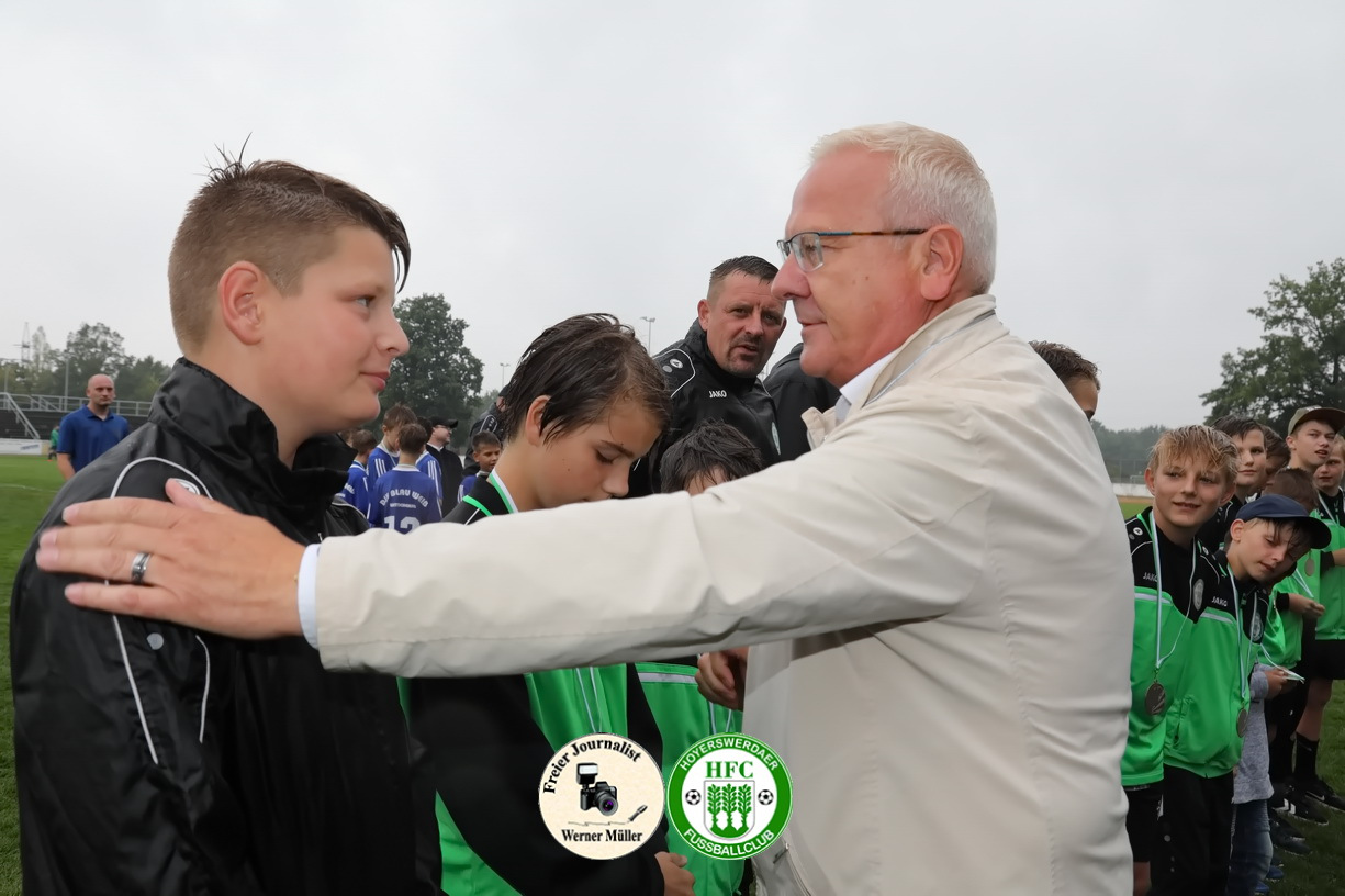 Aufgrund von kurzfristigen Erkrankungen und den widrigen Wetterbedingungen wurde dieses mal eine etwas kleinere aber nicht minderwertige Runde ausgespielt. So traten unsere Sportsfreunde der SG Weixdorf, DJK Blau-Weiß Wittichenau und SG Blau-Weiß Klein Gaglow sowie der heimischen HFC D-Jugend um Spielmodus jeder gegen jeden an. Es wurde gepasst, geschossen, gekämpft und gezaubert und die Trainer sowie Zuschauer konnten ein fußballerisches hochwertiges Turnier beobachten. Am Ende setzten sich die Kids aus Weißdorn verdient und durchgenässt als Turniersieger durch und holten sich den Pokal, aber jeder Spieler verdiente sich eine Medaille und bekam somit eine durch unseren Oberbürgermeister verliehen.