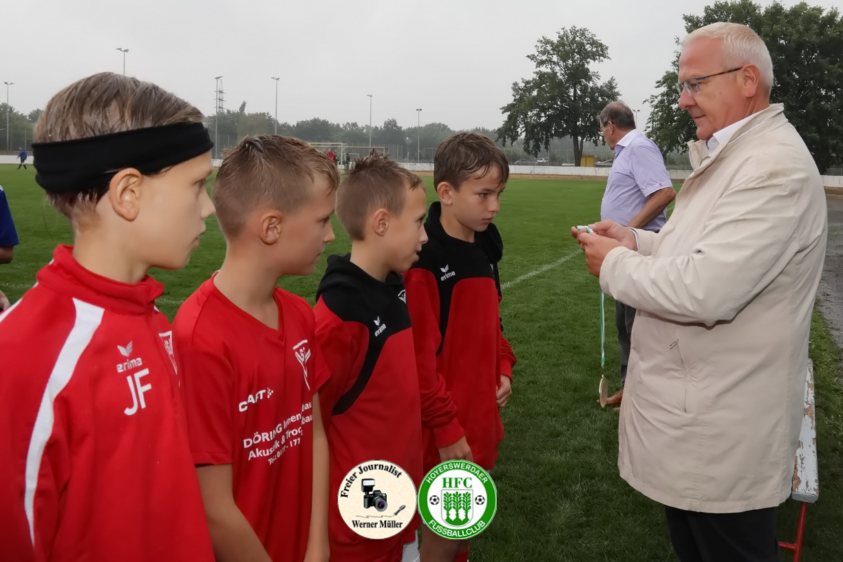 Aufgrund von kurzfristigen Erkrankungen und den widrigen Wetterbedingungen wurde dieses mal eine etwas kleinere aber nicht minderwertige Runde ausgespielt. So traten unsere Sportsfreunde der SG Weixdorf, DJK Blau-Weiß Wittichenau und SG Blau-Weiß Klein Gaglow sowie der heimischen HFC D-Jugend um Spielmodus jeder gegen jeden an. Es wurde gepasst, geschossen, gekämpft und gezaubert und die Trainer sowie Zuschauer konnten ein fußballerisches hochwertiges Turnier beobachten. Am Ende setzten sich die Kids aus Weißdorn verdient und durchgenässt als Turniersieger durch und holten sich den Pokal, aber jeder Spieler verdiente sich eine Medaille und bekam somit eine durch unseren Oberbürgermeister verliehen.