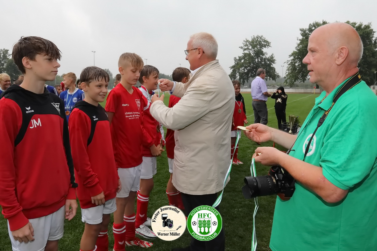 Aufgrund von kurzfristigen Erkrankungen und den widrigen Wetterbedingungen wurde dieses mal eine etwas kleinere aber nicht minderwertige Runde ausgespielt. So traten unsere Sportsfreunde der SG Weixdorf, DJK Blau-Weiß Wittichenau und SG Blau-Weiß Klein Gaglow sowie der heimischen HFC D-Jugend um Spielmodus jeder gegen jeden an. Es wurde gepasst, geschossen, gekämpft und gezaubert und die Trainer sowie Zuschauer konnten ein fußballerisches hochwertiges Turnier beobachten. Am Ende setzten sich die Kids aus Weißdorn verdient und durchgenässt als Turniersieger durch und holten sich den Pokal, aber jeder Spieler verdiente sich eine Medaille und bekam somit eine durch unseren Oberbürgermeister verliehen.