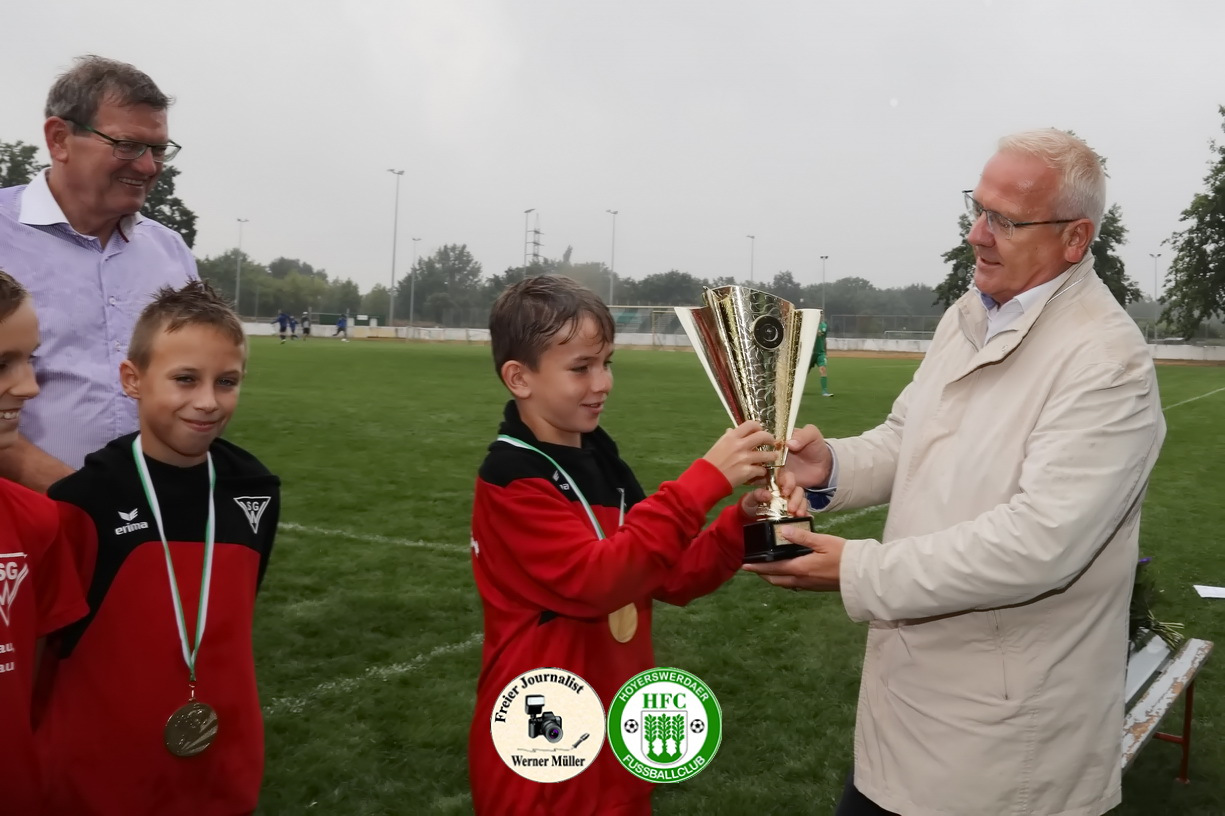 Aufgrund von kurzfristigen Erkrankungen und den widrigen Wetterbedingungen wurde dieses mal eine etwas kleinere aber nicht minderwertige Runde ausgespielt. So traten unsere Sportsfreunde der SG Weixdorf, DJK Blau-Weiß Wittichenau und SG Blau-Weiß Klein Gaglow sowie der heimischen HFC D-Jugend um Spielmodus jeder gegen jeden an. Es wurde gepasst, geschossen, gekämpft und gezaubert und die Trainer sowie Zuschauer konnten ein fußballerisches hochwertiges Turnier beobachten. Am Ende setzten sich die Kids aus Weißdorn verdient und durchgenässt als Turniersieger durch und holten sich den Pokal, aber jeder Spieler verdiente sich eine Medaille und bekam somit eine durch unseren Oberbürgermeister verliehen.