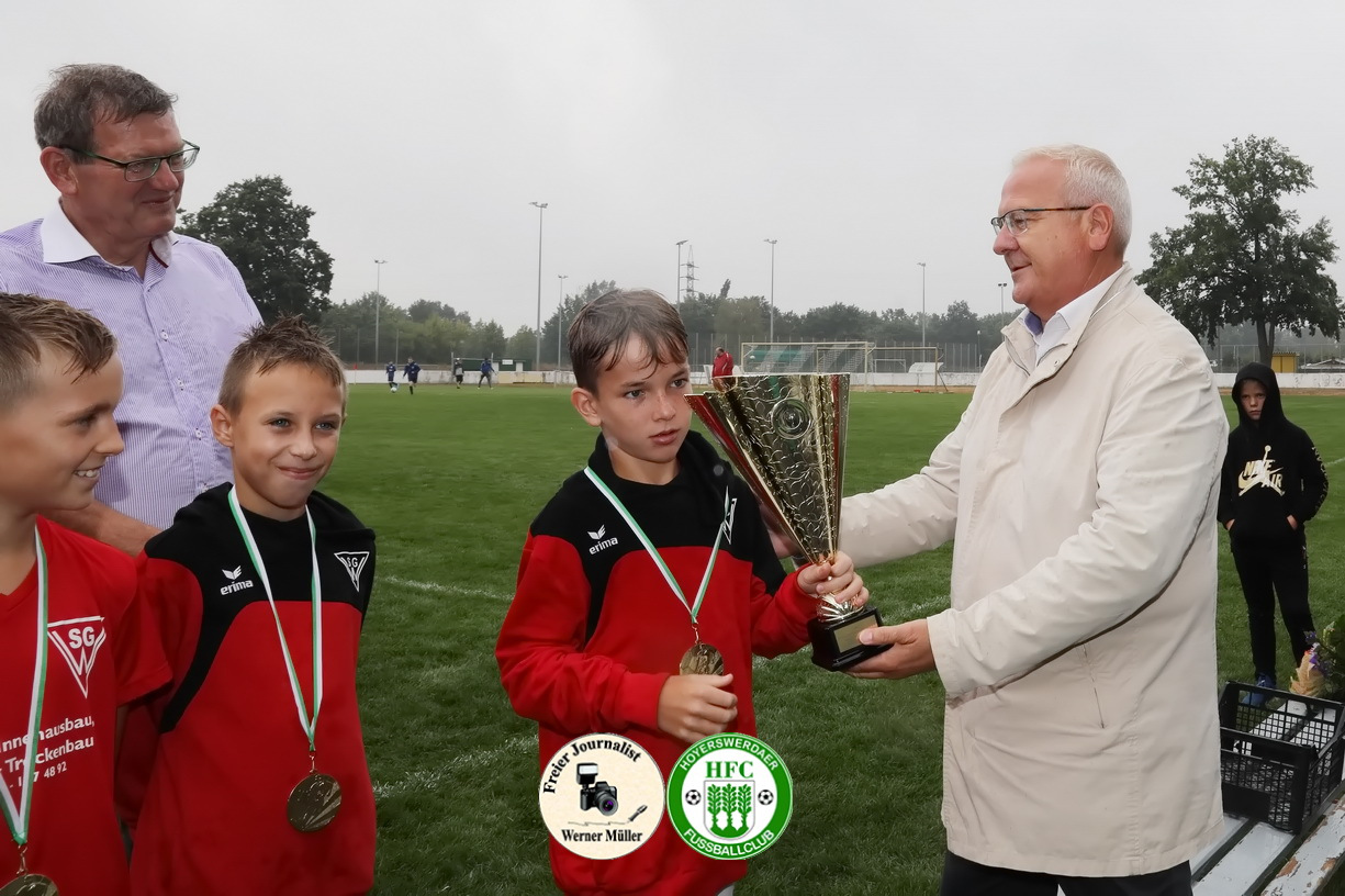 Aufgrund von kurzfristigen Erkrankungen und den widrigen Wetterbedingungen wurde dieses mal eine etwas kleinere aber nicht minderwertige Runde ausgespielt. So traten unsere Sportsfreunde der SG Weixdorf, DJK Blau-Weiß Wittichenau und SG Blau-Weiß Klein Gaglow sowie der heimischen HFC D-Jugend um Spielmodus jeder gegen jeden an. Es wurde gepasst, geschossen, gekämpft und gezaubert und die Trainer sowie Zuschauer konnten ein fußballerisches hochwertiges Turnier beobachten. Am Ende setzten sich die Kids aus Weißdorn verdient und durchgenässt als Turniersieger durch und holten sich den Pokal, aber jeder Spieler verdiente sich eine Medaille und bekam somit eine durch unseren Oberbürgermeister verliehen.