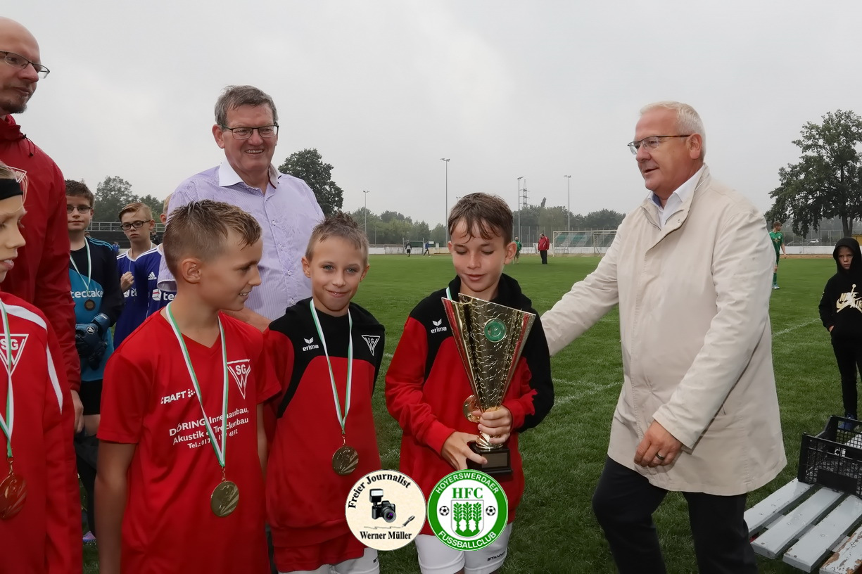 Aufgrund von kurzfristigen Erkrankungen und den widrigen Wetterbedingungen wurde dieses mal eine etwas kleinere aber nicht minderwertige Runde ausgespielt. So traten unsere Sportsfreunde der SG Weixdorf, DJK Blau-Weiß Wittichenau und SG Blau-Weiß Klein Gaglow sowie der heimischen HFC D-Jugend um Spielmodus jeder gegen jeden an. Es wurde gepasst, geschossen, gekämpft und gezaubert und die Trainer sowie Zuschauer konnten ein fußballerisches hochwertiges Turnier beobachten. Am Ende setzten sich die Kids aus Weißdorn verdient und durchgenässt als Turniersieger durch und holten sich den Pokal, aber jeder Spieler verdiente sich eine Medaille und bekam somit eine durch unseren Oberbürgermeister verliehen.