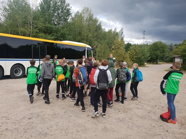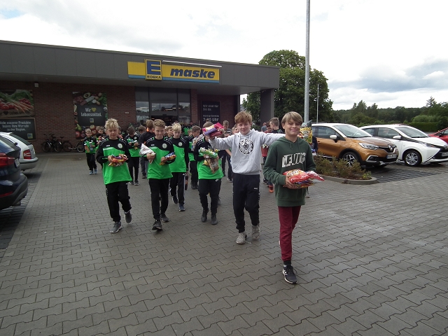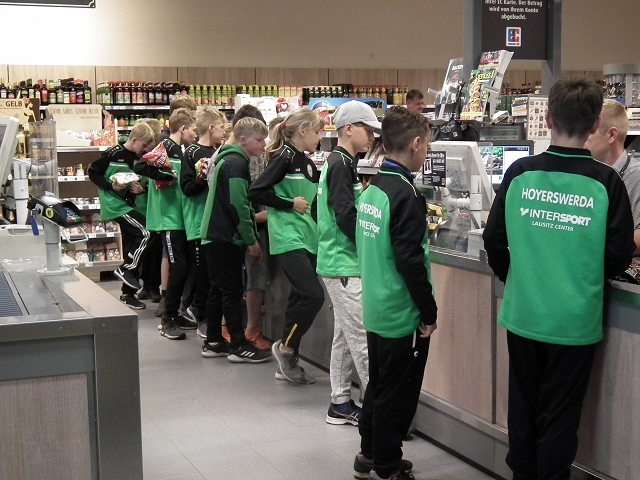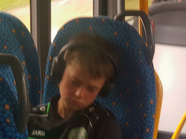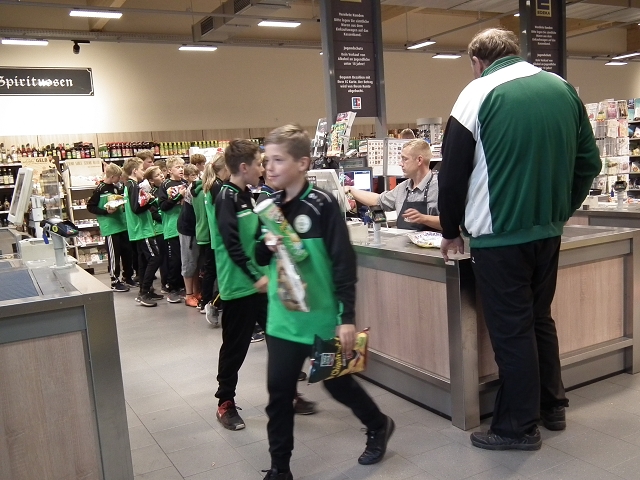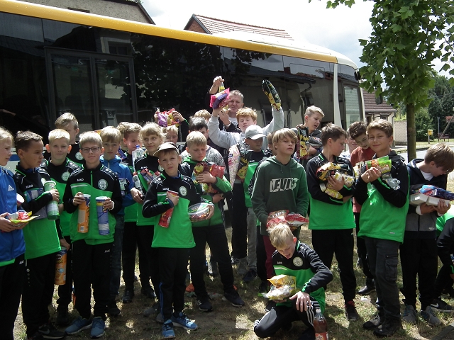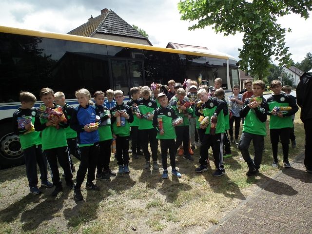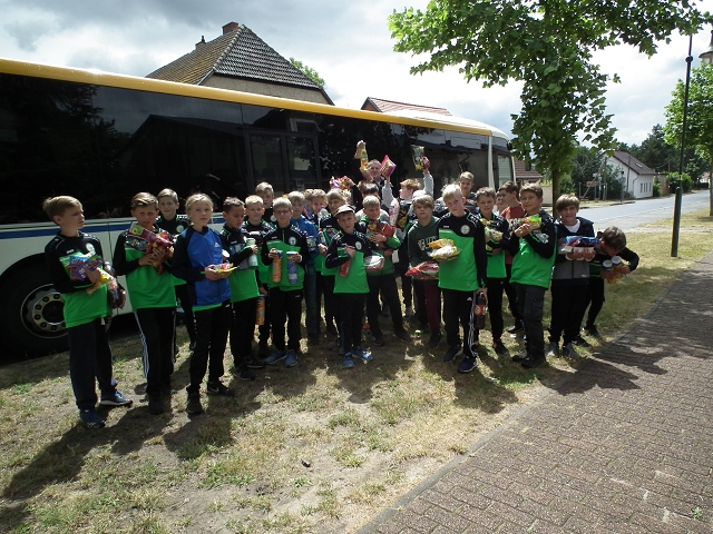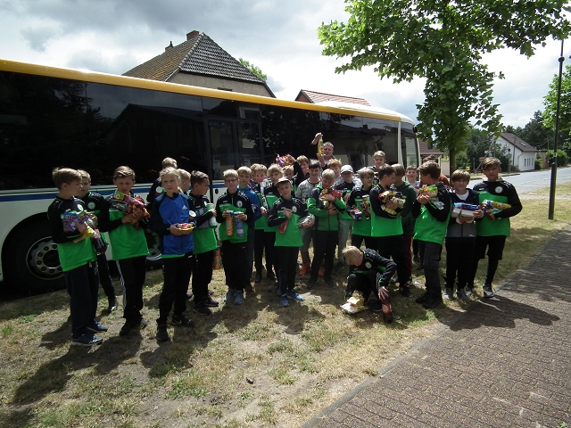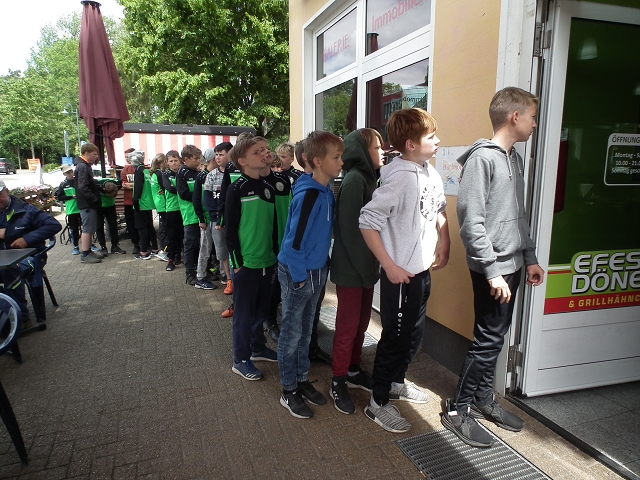 Rückfahrt führte uns wie jedes Jahr an einen etwas größeren Einkaufsmarkt, dessen Namen aus markenrechtlichen Gründen nicht genannt werden kann, vorbei. Vollbremsung, alle raus, Süßigkeitsregal geplündert, Chef des Marktes glücklich. Nun wieder rein in Bus, nächsten Stop in Wandlitz zum Essen. Bis alle satt waren brauchten wir 1,5h. Es ist auch nicht so einfach für die Besitzer eines Dönerstandes allen Wünschen der Kinder gerecht zu werden. Ein Spieler hatte sich im Kletterwald so verausgabt, dass er sich ein ganzes Hähnchen bestellte. Zu unserem Erstaunen war dieses Federtier nach etwa 20 Minuten Geschichte.