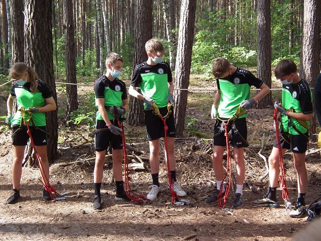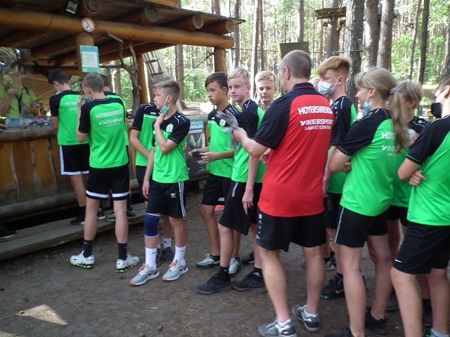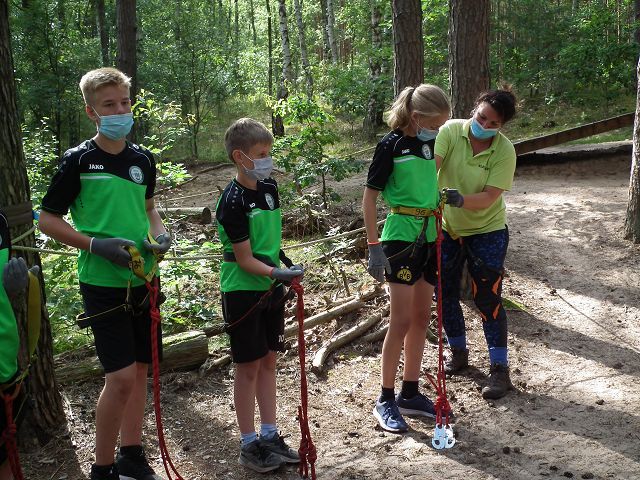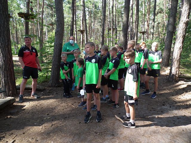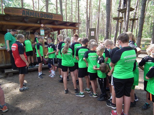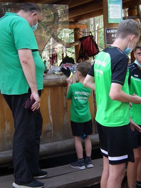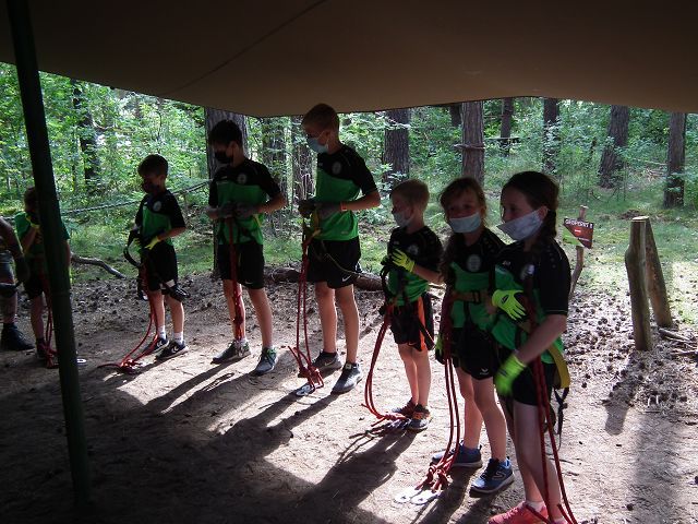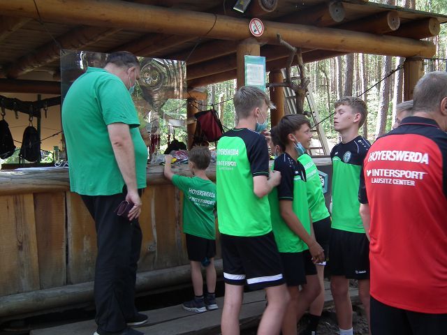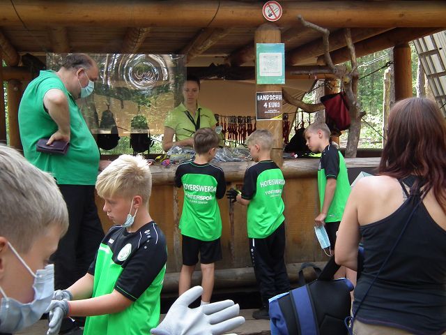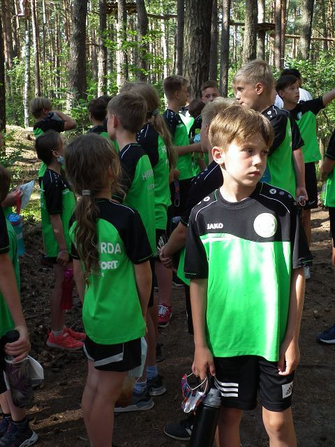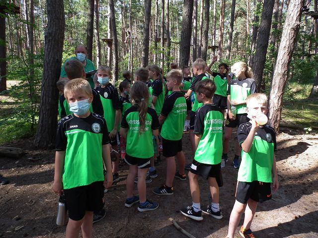 Im Kletterwald angekommen: 32 Kinder und drei Betreuer haben eingecheckt, nur ein Kind hatte zum klettern keine Lust. Er konnte aber nebenan im Wildpark gemeinsam mit Busfahrer + Frau Tiere bestaunen. Nach einer etwa einstündigen Einweisung (Gurte anlegen, Probeparcours) konnte es nun endlich losgehen. Und hier begannen die Probleme der Betreuer. So viele kleine Kinder, die doch hier und da Hilfe brauchten, da war schon gut zu tun. Aber nach einigen Hinweisen hat es dann doch super (fast) von allein geklappt. Bei den Großen gab es nun wieder gar keine Probleme. Die schwierigsten Bahnen wurden in Rekordzeit absolviert. Das tollste ist eigentlich, das man sich um die Burschen gar nicht kümmern muss. Hier klappt wirklich alles super. Nach 19 Uhr waren alle wieder runter und auf dem Boden der Tatsachen angelangt. Die Arme taten weh, aber das war nicht das Schlimmste. Was, liebe Eltern, erzeugt schlechte Laune und macht Kinder zum Teil ein klein wenig böse??? à HUNGER !!
