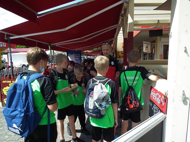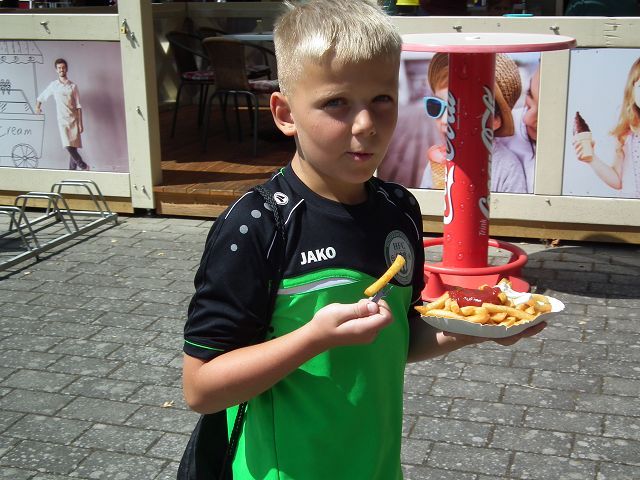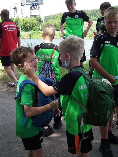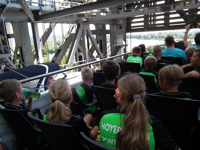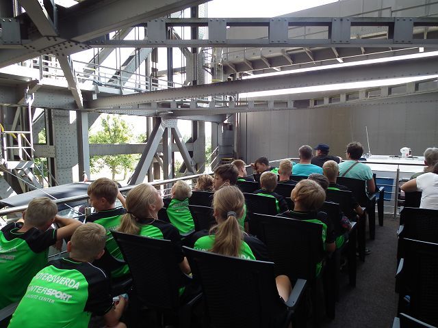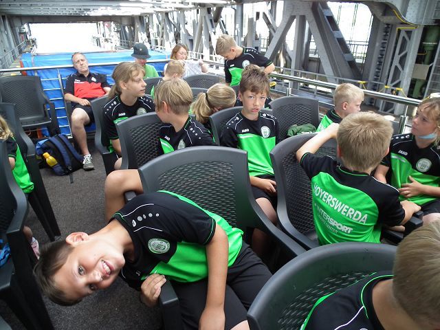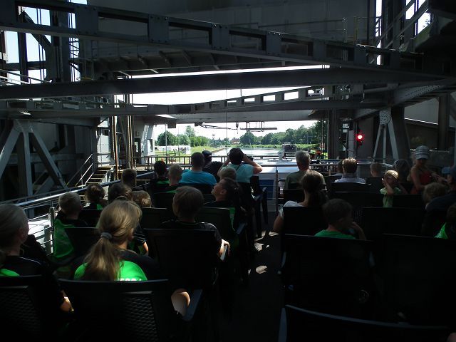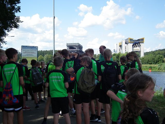 Pünktlich um 7:00 Uhr haben wir uns aus den Betten gequält. Es musste früh alles ein wenig schneller gehen, da wir den Tag voll durchgeplant haben. Zuerst haben wir uns mal um die lebenden Dosen der Kinder gekümmert. Bei einigen haben wir schon gedacht der Inhalt würde mit uns sprechen, naja, auch das haben wir überstanden. Danach natürlich Frühstück (hier gab es auch frisches Obst), diesmal gleich in Vereinskleidung, damit wir sofort zum Bus konnten. Erster Termin war um 10:00 Uhr Parkplatz Schiffshebewerk Niederfinow. Wir hatten telefonisch die Bootstour durch das Hebewerk für 11:00 Uhr gebucht. Fast pünktlich angekommen (10:20 Uhr) war Herr Gutewort sofort an der Kasse zum bezahlen und dann mit den Kids und den anderen Erwachsenen unterwegs zum Anleger. Herr Großmann und Herr Hering hatten erstmal an den Imbissständen zu tun, um schon das Mittagessen für etwa 12:30 Uhr zu ordern. Bis dahin hat also alles funktioniert. Alle pünktlich auf dem Schiff und dann ging es auch schon los. Ist schon ein etwas komisches Gefühl, wenn es etwa 40 Meter in die Höhe geht. Bei einigen Kindern wurden die Augen immer größer. Das lag aber nicht an Angst, sondern war eher ein großes Staunen. Oben angelangt dreht dann das Boot auf dem Kanal und schon geht es wieder abwärts. Es gab Kinder, welche sogar kleine Krokodile gesehen haben wollen. Wir wissen nicht genau, ob dass so stimmt. Als wir hingeschaut haben waren sie schon wieder abgetaucht. Am Ende haben wir alles gut überstanden. Wieder am Steg angekommen folgte ein kurzer Fußmarsch zum Essen. Alle Kinder wurden satt, was es gab seht ihr ja auf den Fotos. Danach noch für alle ein Eis. Beide Dinge sind mit 40 Personen schon eine kleine Herausforderung, aber unsere Betreuer haben alle Situationen voll im Griff. Nun wieder zum Bus und auf zur nächsten Station.
