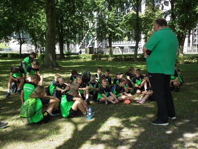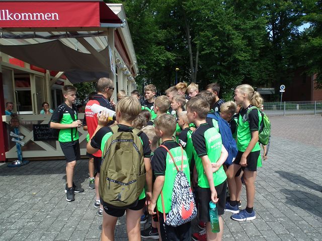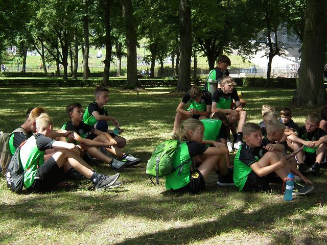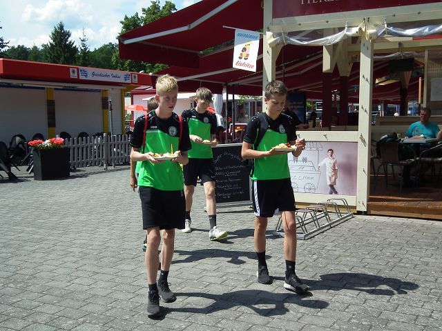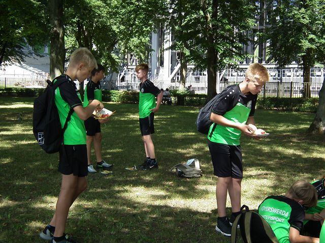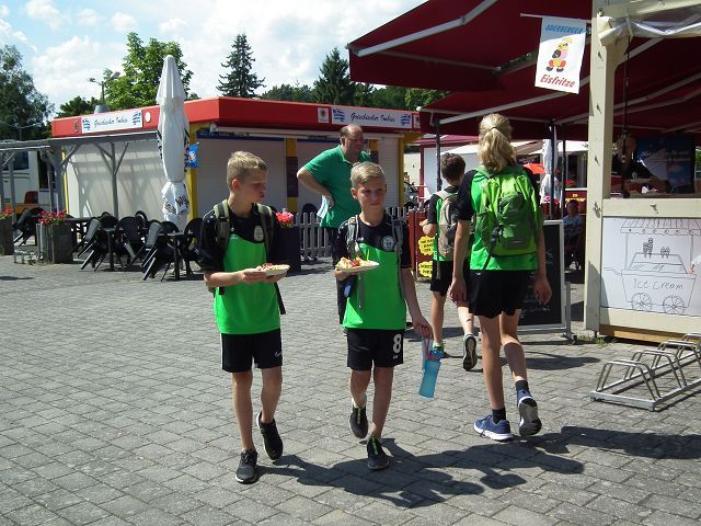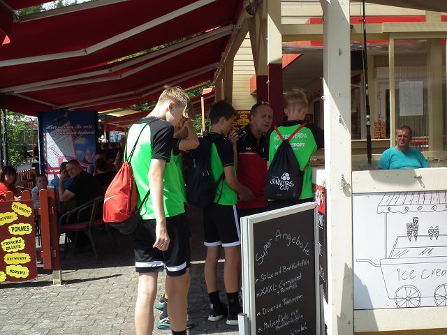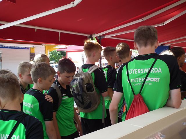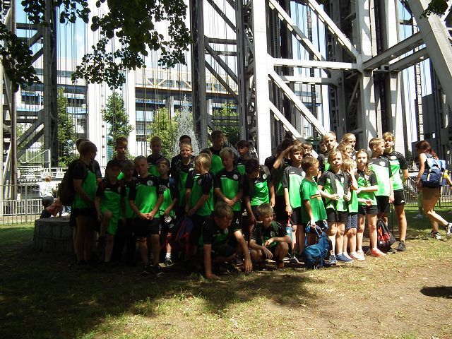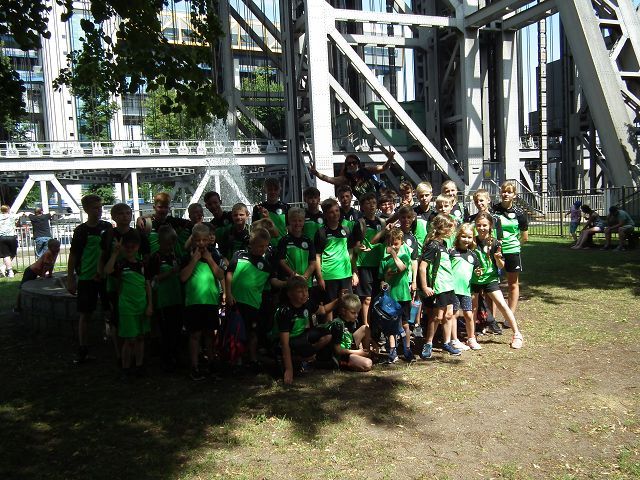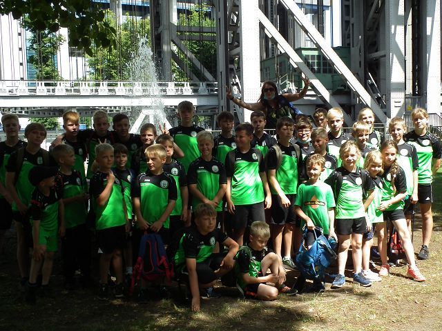 Pünktlich um 7:00 Uhr haben wir uns aus den Betten gequält. Es musste früh alles ein wenig schneller gehen, da wir den Tag voll durchgeplant haben. Zuerst haben wir uns mal um die lebenden Dosen der Kinder gekümmert. Bei einigen haben wir schon gedacht der Inhalt würde mit uns sprechen, naja, auch das haben wir überstanden. Danach natürlich Frühstück (hier gab es auch frisches Obst), diesmal gleich in Vereinskleidung, damit wir sofort zum Bus konnten. Erster Termin war um 10:00 Uhr Parkplatz Schiffshebewerk Niederfinow. Wir hatten telefonisch die Bootstour durch das Hebewerk für 11:00 Uhr gebucht. Fast pünktlich angekommen (10:20 Uhr) war Herr Gutewort sofort an der Kasse zum bezahlen und dann mit den Kids und den anderen Erwachsenen unterwegs zum Anleger. Herr Großmann und Herr Hering hatten erstmal an den Imbissständen zu tun, um schon das Mittagessen für etwa 12:30 Uhr zu ordern. Bis dahin hat also alles funktioniert. Alle pünktlich auf dem Schiff und dann ging es auch schon los. Ist schon ein etwas komisches Gefühl, wenn es etwa 40 Meter in die Höhe geht. Bei einigen Kindern wurden die Augen immer größer. Das lag aber nicht an Angst, sondern war eher ein großes Staunen. Oben angelangt dreht dann das Boot auf dem Kanal und schon geht es wieder abwärts. Es gab Kinder, welche sogar kleine Krokodile gesehen haben wollen. Wir wissen nicht genau, ob dass so stimmt. Als wir hingeschaut haben waren sie schon wieder abgetaucht. Am Ende haben wir alles gut überstanden. Wieder am Steg angekommen folgte ein kurzer Fußmarsch zum Essen. Alle Kinder wurden satt, was es gab seht ihr ja auf den Fotos. Danach noch für alle ein Eis. Beide Dinge sind mit 40 Personen schon eine kleine Herausforderung, aber unsere Betreuer haben alle Situationen voll im Griff. Nun wieder zum Bus und auf zur nächsten Station.