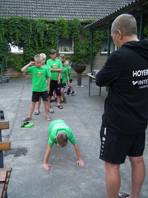 Zu den Liegestützen folgende Erklärung: kein Kind musste welche machen, aber plötzlich wollte jemand ins Zimmer. Es durfte – ein Liegestütz. Nun kam der Nächste. Wir begannen zu zählen und kamen auf zwei. Schlecht war die Geschichte für den Letzten.