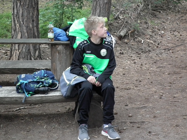 Rückfahrt führte uns wie jedes Jahr an einen etwas größeren Einkaufsmarkt, dessen Namen aus markenrechtlichen Gründen nicht genannt werden kann, vorbei. Vollbremsung, alle raus, Süßigkeitsregal geplündert, Chef des Marktes glücklich. Nun wieder rein in Bus, nächsten Stop in Wandlitz zum Essen. Bis alle satt waren brauchten wir 1,5h. Es ist auch nicht so einfach für die Besitzer eines Dönerstandes allen Wünschen der Kinder gerecht zu werden. Ein Spieler hatte sich im Kletterwald so verausgabt, dass er sich ein ganzes Hähnchen bestellte. Zu unserem Erstaunen war dieses Federtier nach etwa 20 Minuten Geschichte.