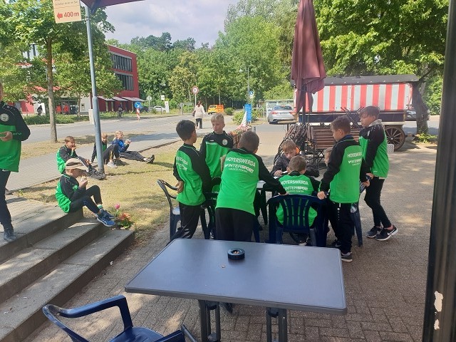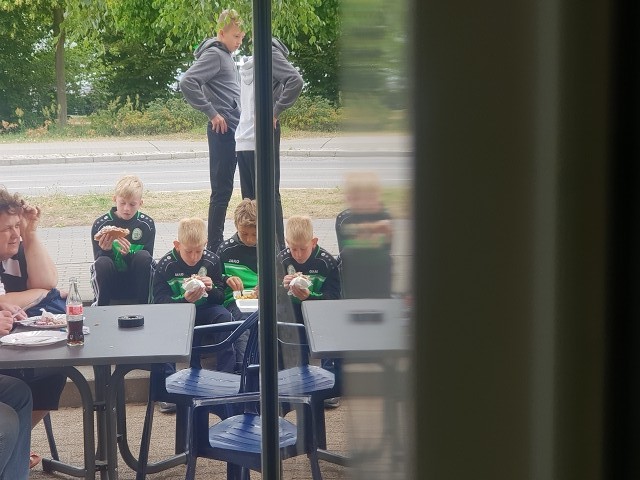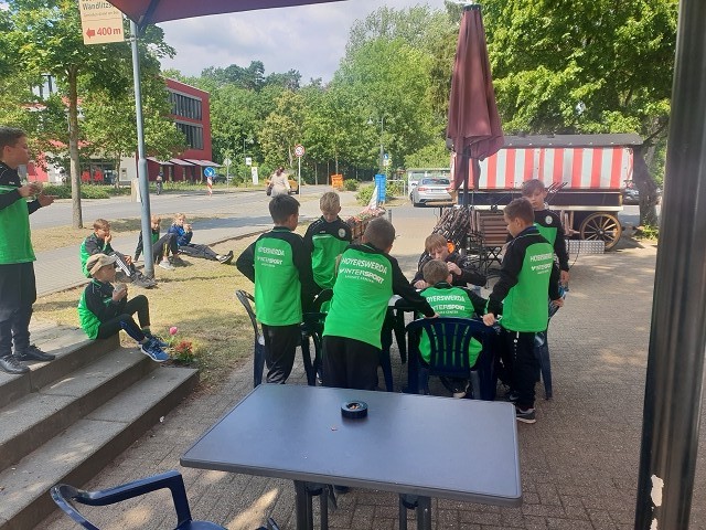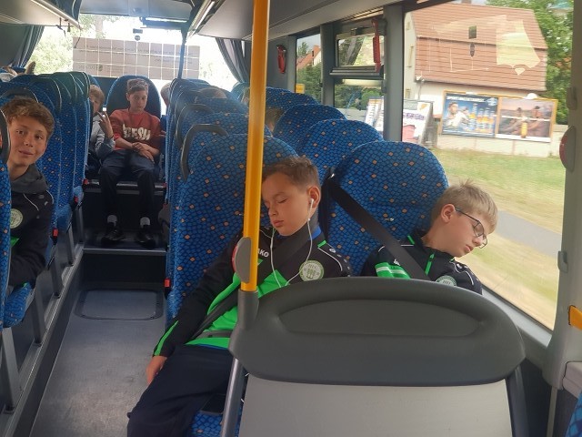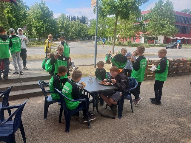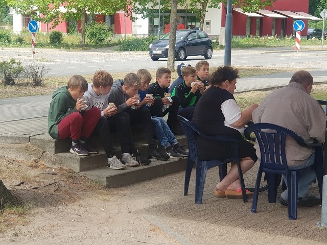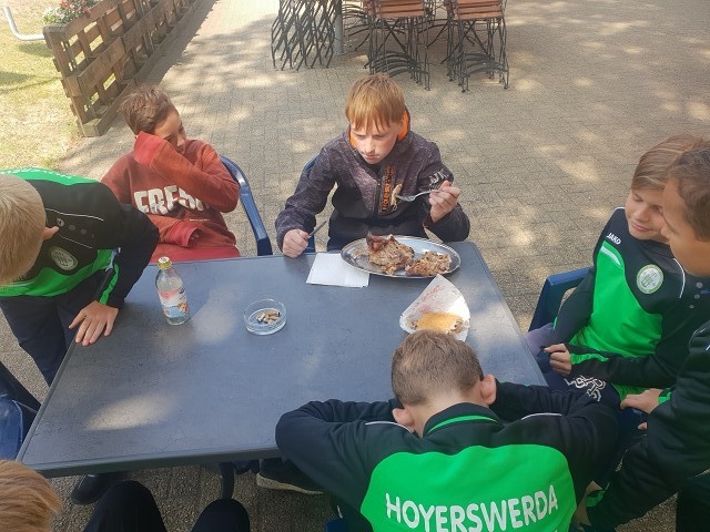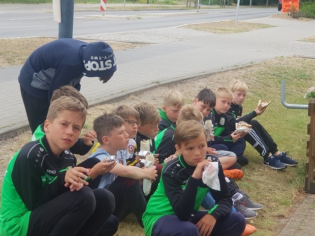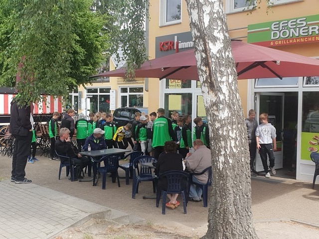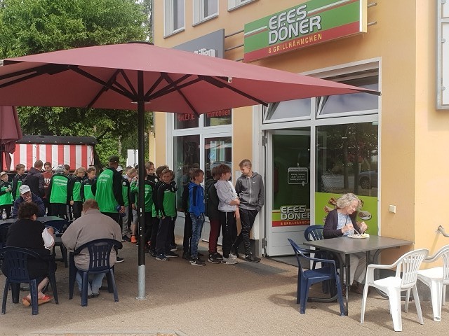 Rückfahrt führte uns wie jedes Jahr an einen etwas größeren Einkaufsmarkt, dessen Namen aus markenrechtlichen Gründen nicht genannt werden kann, vorbei. Vollbremsung, alle raus, Süßigkeitsregal geplündert, Chef des Marktes glücklich. Nun wieder rein in Bus, nächsten Stop in Wandlitz zum Essen. Bis alle satt waren brauchten wir 1,5h. Es ist auch nicht so einfach für die Besitzer eines Dönerstandes allen Wünschen der Kinder gerecht zu werden. Ein Spieler hatte sich im Kletterwald so verausgabt, dass er sich ein ganzes Hähnchen bestellte. Zu unserem Erstaunen war dieses Federtier nach etwa 20 Minuten Geschichte.
